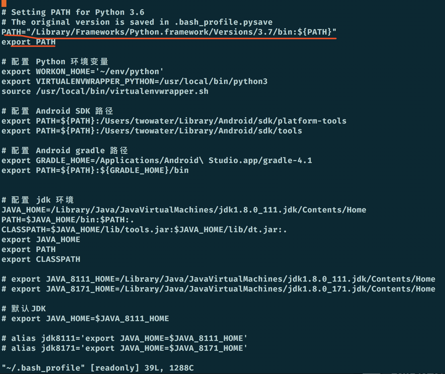 vi ~/.bash_profile我装的是 Python3.7 ,Python 执行路径为:/Library/Frameworks/Python. Framework/Versions/3.7/bin 。于是写入