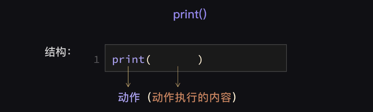 这里先说一下 print() 函数,如果你是新手,可能对函数不太了解,没关系,在这里你只要了解它的组成部分和作用就可以了,后面函数这一块会详细说明的。