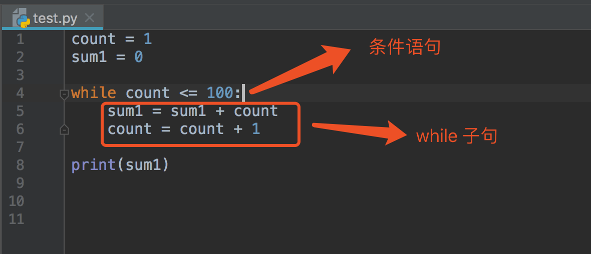 有时候,我们只想统计 1 到 100 之间的奇数和,那么也就是说当 count 是偶数,也就是双数的时候,我们需要跳出当次的循环,不想加,这时候可以用到 break