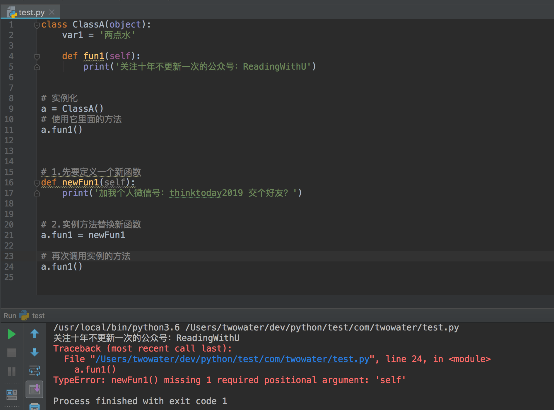 要注意的是,这里的赋值是在替换方法,并不是调用函数。所以是不能加上括号的,也就是 类.原始函数() = 新函数() 这个写法是不对的。